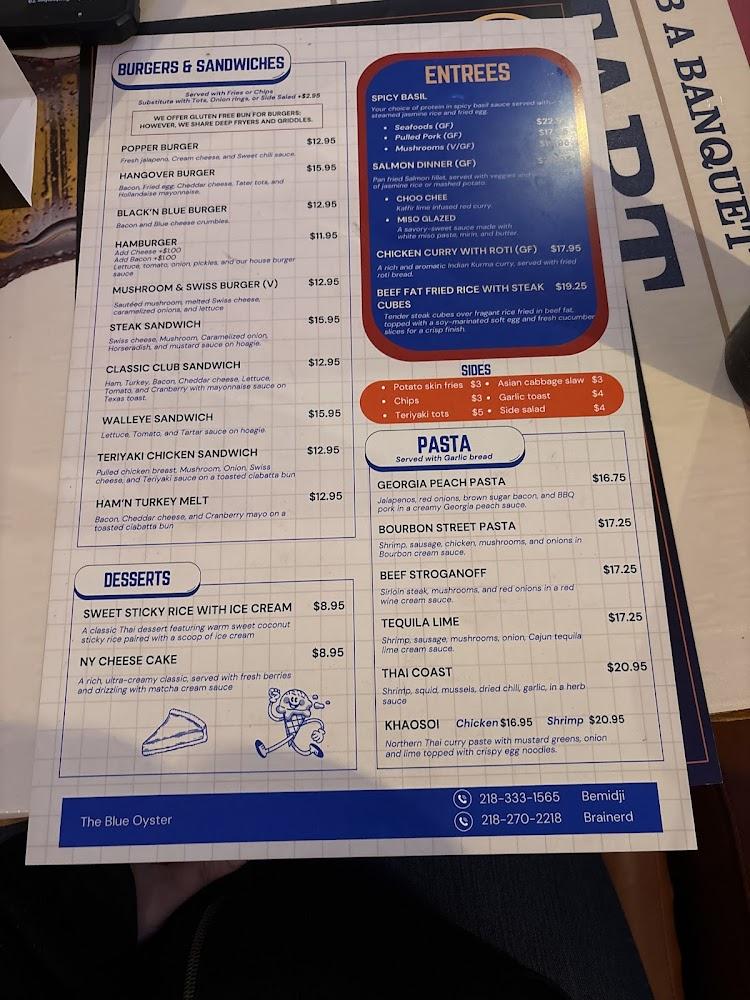 Welcome to Blue Oyster, your go-to American neighborhood bar in Brainerd, MN, where vibrant flavors meet a casual atmosphere. Savor our extraordinary Thai dishes crafted from locally sourced ingredients and mushrooms from our own farms. Whether you're grabbing a quick lunch, enjoying dinner with friends, or unwinding during happy hour, our diverse menu and excellent cocktails promise something for everyone. Enjoy live concerts, a wide selection of beers, and fast service in an accessible setting. Join us at 612 Front St for great food, drinks, and a memorable experience in a relaxed ambiance. Call us at +1 218-270-2218 for more information!